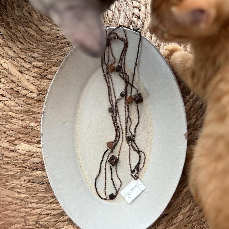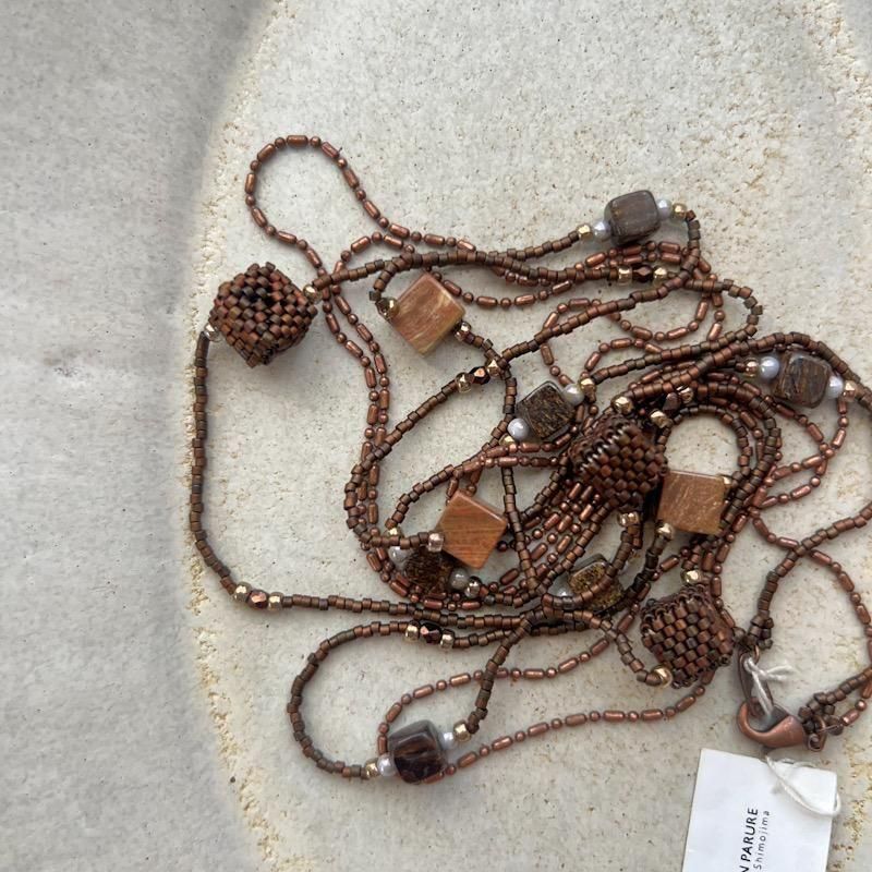 使用素材は四角のジャスパーやブロンザイト、ニュアンスカラーのチェコビーズとポイントカラーにブロンズのチェコやシードビーズを使い形の整ったデリカビーズで編み込んだ四角いパーツでデザインされたシンプルだけど、それぞれに想いがこもったネックレスです。