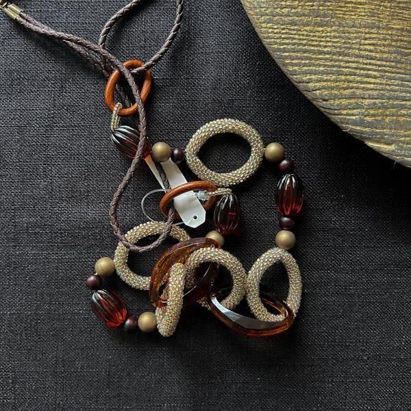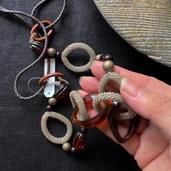 2006年にデザインした琥珀色のネックレスはレース針で編むパーツを作って繋げる軽やかなネックレスのご紹介です。大ぶりなパーツを使っているので重さがあるように見えますが約50gと非常に軽いネックレスです。長さは約88cm。四つ打ちレザーと琥珀色のパーツを合わせて編み上げたベージュカラーのビーズと非常にバランスがよく品よく仕上がったと思います。今から19年前にデザインしたネックレスとは思えない・・・と自画自賛(笑)